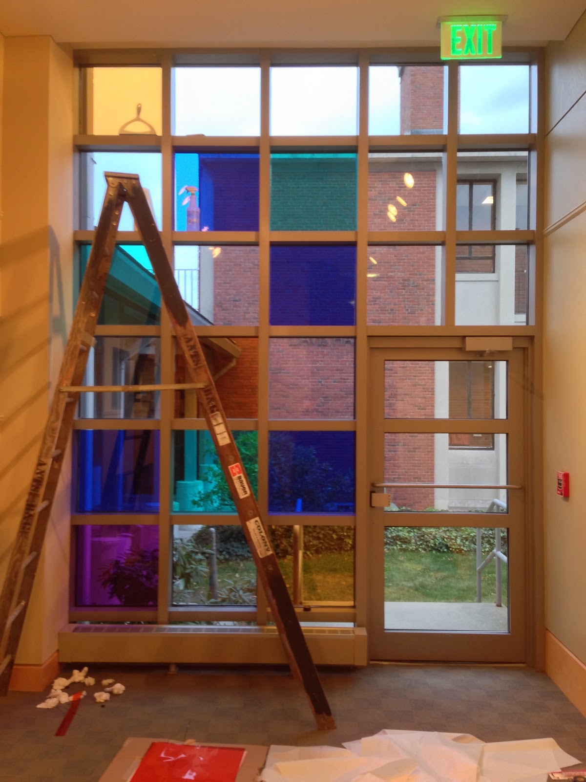 The colors are selected for their ability to blend in surprising ways, especially the complementary colors that gray out the landscape or the light streaming through. They also happen to serendipitously coincide with the colors in the stained glass logo of the Rabbinical School that resides on the campus.